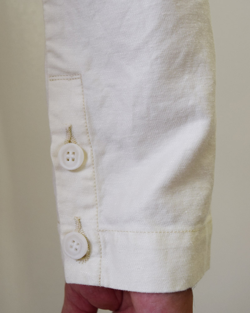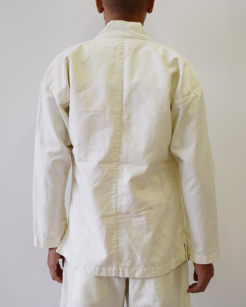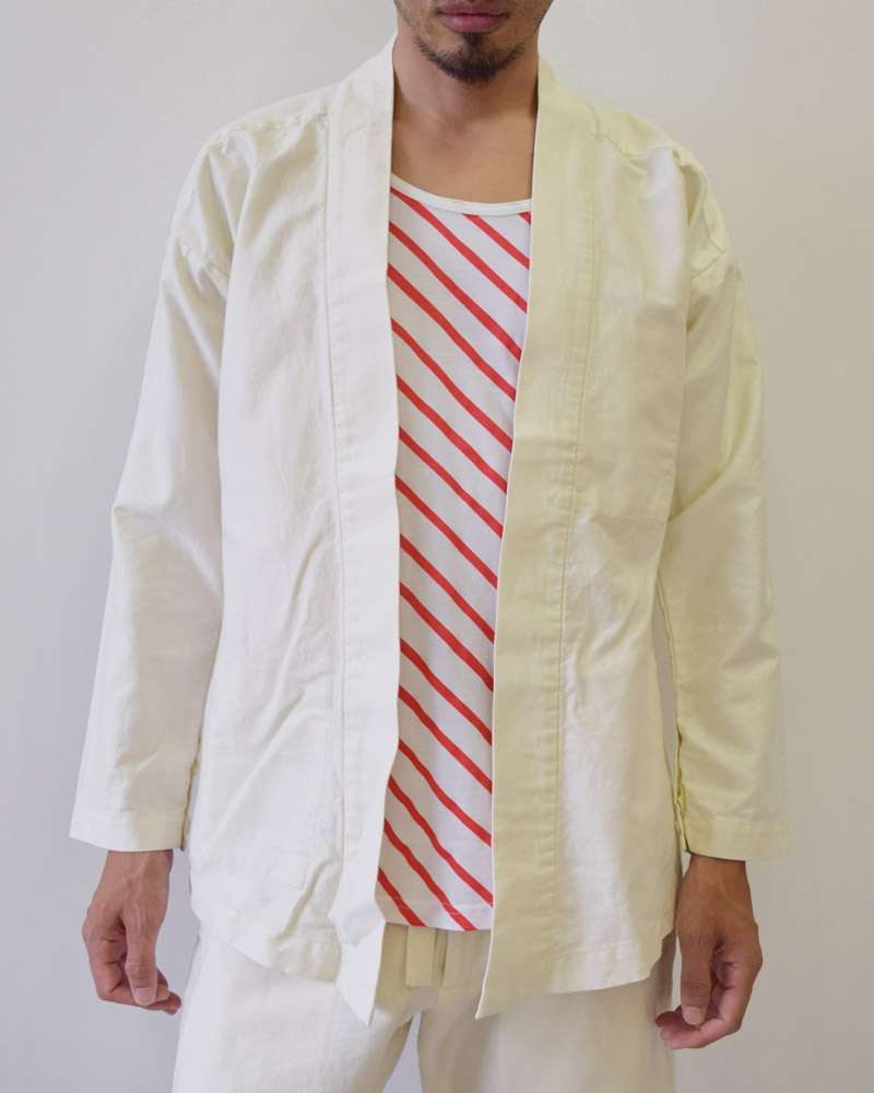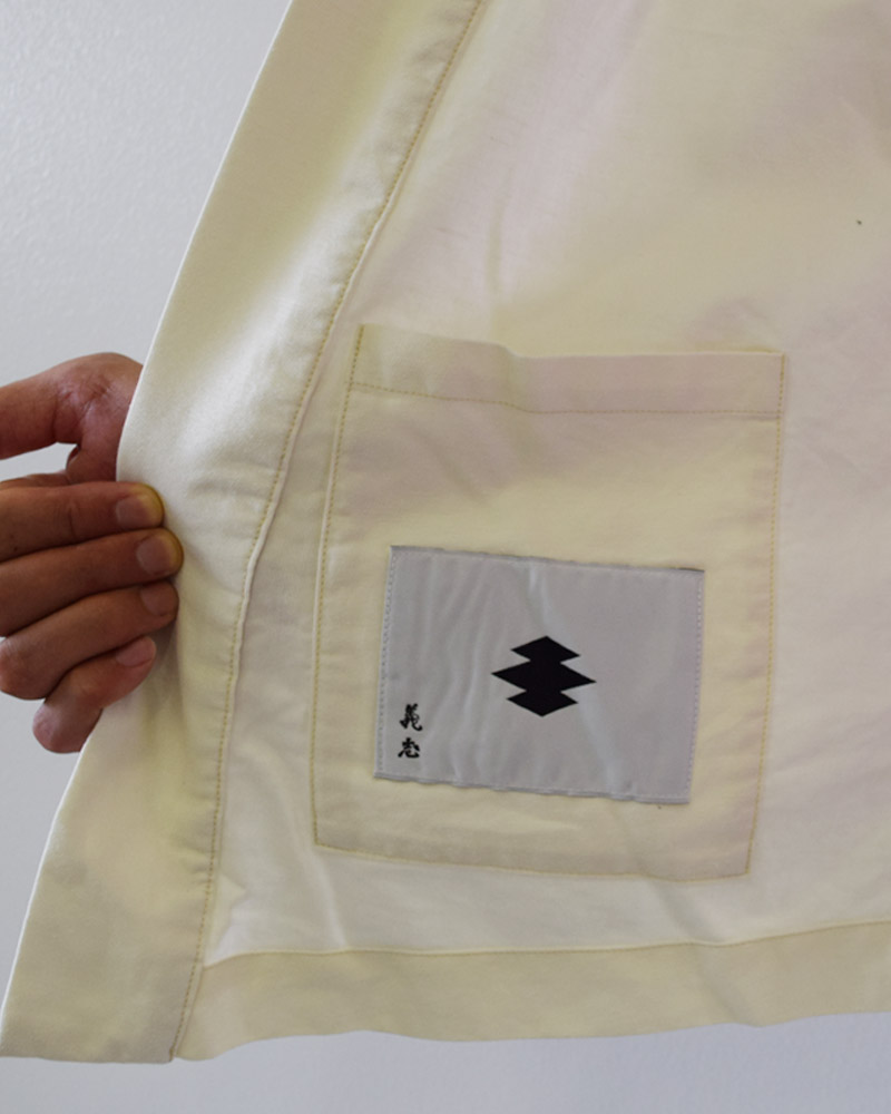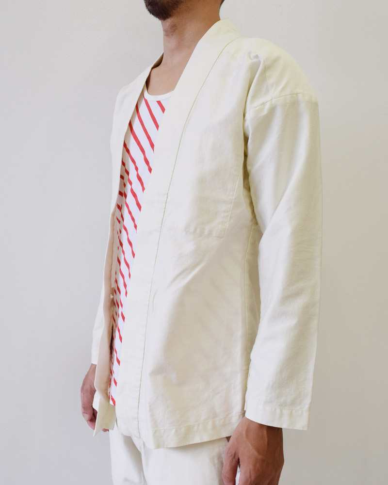 | DESCRIPTION | This is a proposal of Yoshiyuki’s haori or Japanese style half-coat, a cross between kimonos and martial arts uniforms and can be comfortably used as coveralls. It may look as flat patterned design but integrates the traditional Japanese straight cuttings and the steric Western tailoring techniques for comfortable fitting and modern day universal styling. Material : cotton x linen light moleskin |